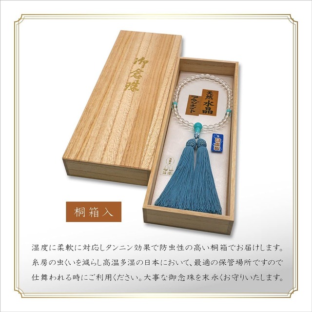・ 防虫、防湿効果を持ち、大切な御念珠を保管するに相応しい桐箱(日本製)へ納めてお届けします。外箱サイズ 幅93mm×奥行256mm×高さ29mm